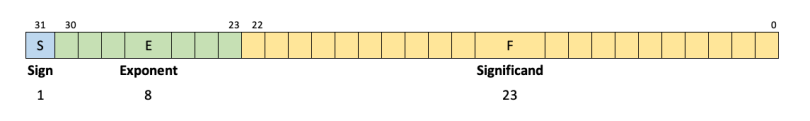 Sign 비트는 부호를 나타내는 것으로 0이면 양수, 1이면 음수를 의미합니다. 23비트인 가수부(Significand)에는 정규화한 소수부를 넣어줍니다. 남은 자리는 0으로 채워집니다. 8비트인 지수부(Exponent)에는 지수에 해당하는 3이 들어가면 되는데 바로 3을 넣는게 아닌 IEEE 표준에서 정한 bias를 더한 값을 2진수로 변환하여 넣습니다. IEEE 표준 32비트의 bias는 127이기 때문에 127 + 3 = 130 의 2진수인 10000010이 들어간다. 이렇게 bias를 더해주는 이유는 지수가 음수인 경우를 표현하기 위함입니다.