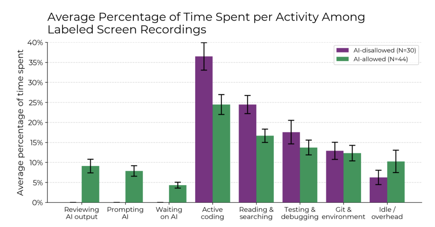 실제로 25년 상반기에 코넬대학교 연구팀에서는 5년차 이상의 경력 개발자들을 대규모 오픈 소스 프로젝트를 개발하는 연구를 진행했는데, AI를 사용했을 때보다 AI를 사용하지 않았을 때 생산성이 높게 나오는 통계가 나오기도 했습니다. 아래 그래프처럼 프롬프팅하고, AI를 기다리고 결과물을 검토하는 시간이 생각보다 오래걸렸기 때문입니다.